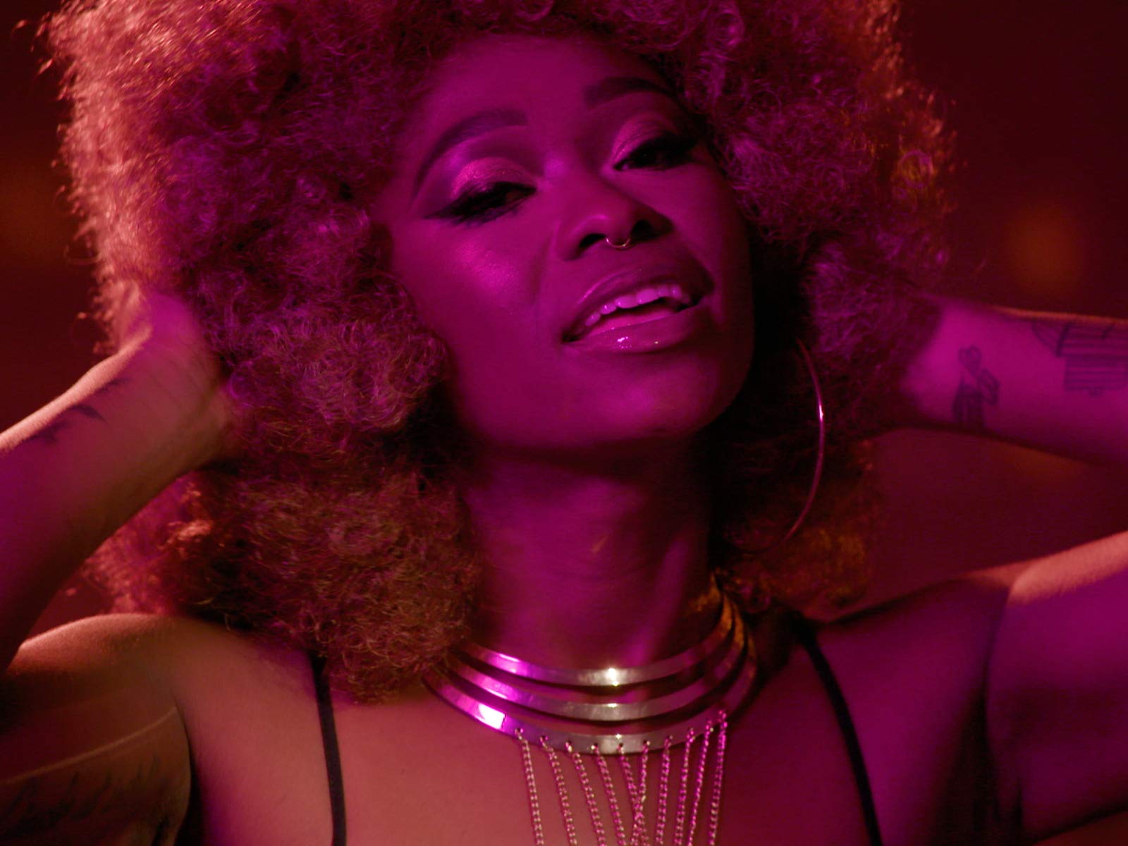 A dusty pink short bob that just grazes her. It is long lasting and although it is still bright and bold the pink is toned out to a more sophisticated hue that most ladies can pull off.